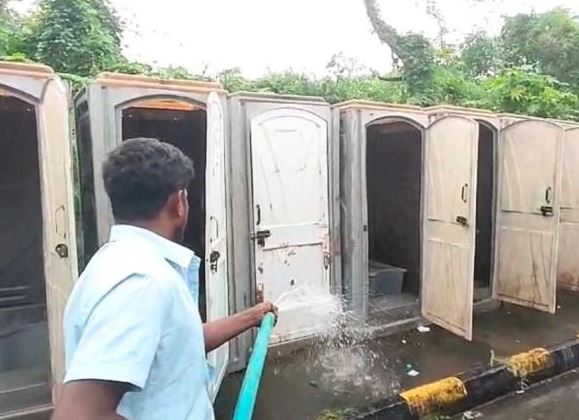 To ensure sanitation, the civic body has set up 250 toilets at the Exhibition Centre, maintained by a dedicated team of 30 workers and one municipal engineer, supported by five suction machines. Around 35 staff members work in three shifts to handle round-the-clock cleaning, assisted by six waste transport vehicles. At the APMC, 10 sanitation workers, two officers, and two vehicles are deployed on continuous duty.