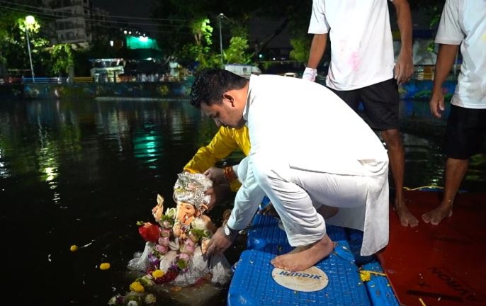 The atmosphere came alive with the beats of dhol-tasha, firecrackers, and vibrant dancing as devotees joined in chanting “Ganpati Bappa Morya, Mangal Murti Morya”, filling the surroundings with devotional energy. Sahil Chougule, along with his family members, performed the traditional puja, aarti, and rituals before bidding an emotional farewell to Lord Ganesha.
